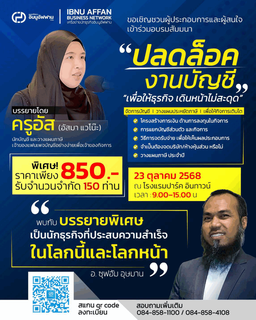 สหกรณ์อิสลาม อิบนูอัฟฟาน จำกัด ขอเชิญผู้ประกอบการและผู้สนใจเข้าร่วมอบรมสัมมนา IBNU AFFAN BUSINESS NETWORK ในหัวข้อเรื่อง “ปลดล็อคงานบัญชี เพื่อให้ธุรกิจเดินหน้าไม่สะดุด” โดยครูอัส (อัสมา แวโน๊ะ) เจ้าของเพจ บัญชีอย่างง่ายเพื่อเจ้าของกิจการ และรับฟังบรรยายพิเศษ “เป็นนักธุรกิจที่ประสบความสำเร็จ ในโลกนี้และโลกหน้า” โดย อ.ซุฟอัม อุษมาน ค่าลงทะเบียน 850 บาท รับจำนวนจำกัดเพียง 150 ท่าน ในวันพฤหัสบดี ที่ 23 เดือนตุลาคม พ.ศ.2568 เวลา 09.00-15.00 น. ณ โรงแรมปาร์ค อินทาวน์ เมืองปัตตานี สอบถามเพิ่มเติม 084-858-1100 และ 084-858-4108