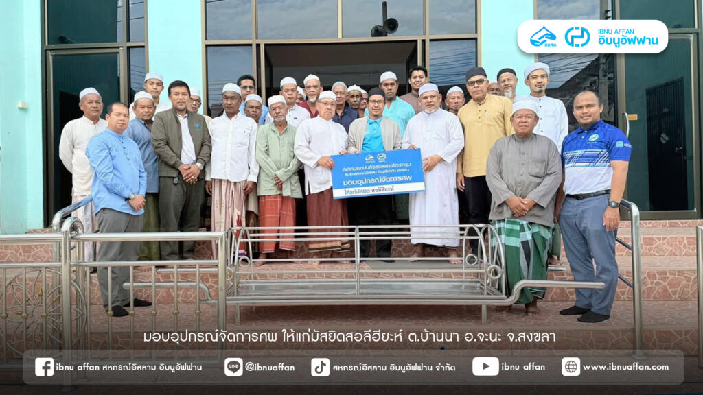 เมื่อวันอาทิตย์ ที่ 26 ตุลาคม 2568 สหกรณ์อิสลาม อิบนูอัฟฟาน จำกัด ร่วมกับสมาคมฌาปนกิจสงเคราะห์ตะอาวุนสมาชิกสหกรณ์อิสลาม อิบนูอัฟฟาน ได้เดินทางมอบอุปกรณ์อุปกรณ์จัดการศพให้แก่มัสยิดสอลีฮียะห์ ต.บ้านนา อ.จะนะ จ.สงขลา โดยมีนายหวันอับดุลรอณี เหละดุหวี ผู้จัดการใหญ่สหกรณ์อิสลาม อิบนูอัฟฟาน จำกัด และนายกสมาคมฌาปนกิจฯ เป็นตัวแทนสมาชิกในการมอบอุปกรณ์จัดการศพให้แก่มัสยิด และมีนายอาซิ สอเด ผู้แทนมัสยิดเป็นผู้รับมอบอุปกรณ์ที่ใช้สำหรับขนย้ายศพ